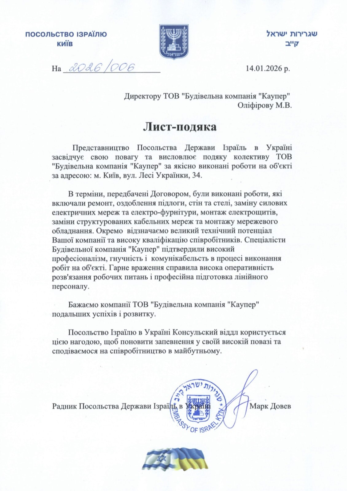 Висловлюємо вдячність директору Оліфірову Миколі Вікторовичу за бездоганне виконання Договірних обов'язків «Будівельною компанією «Каупер» по проведенню комплексних оздоблювальних робіт на об'єкті: